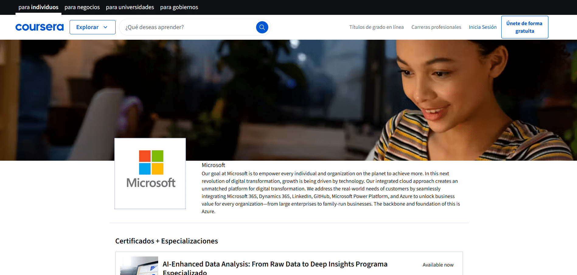 - Coursera: Certificados Profesionales de Microsoft orientados al empleo, en áreas como IA, Power BI, Ciberseguridad o UX. Son programas guiados con proyectos prácticos, perfectos para añadir a tu CV y perfil de LinkedIn.